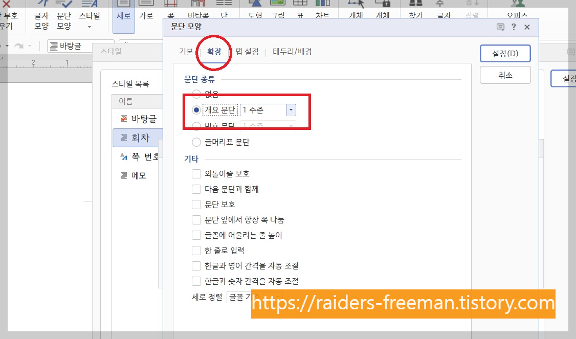 [개요문단]을 [1수준]으로 설정합니다.